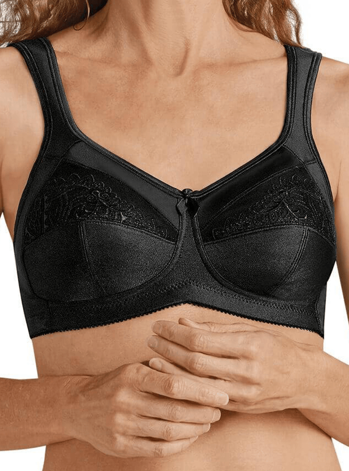 Adjustable elastic wide padded straps; straps increase in width to maintain support in larger sizes