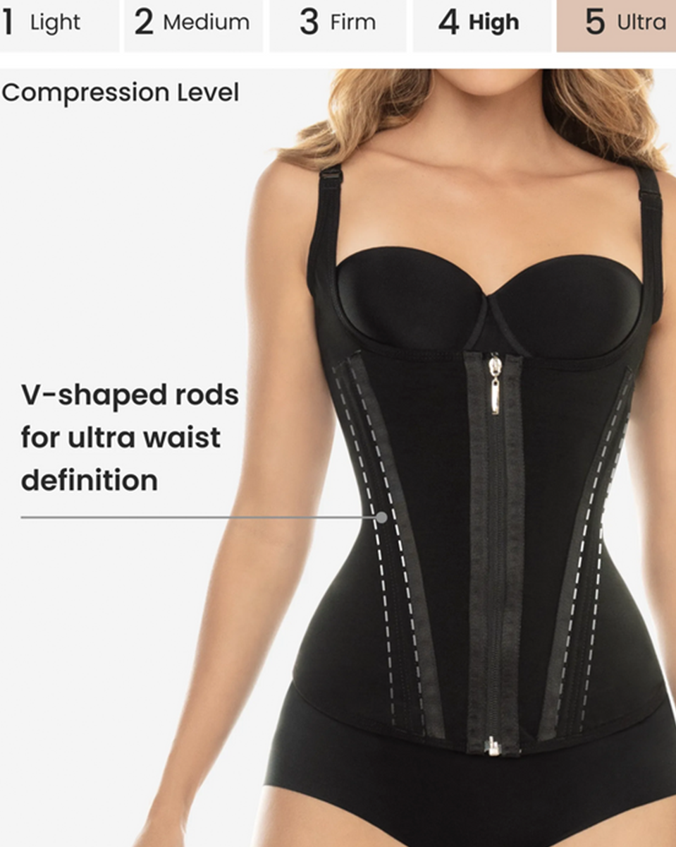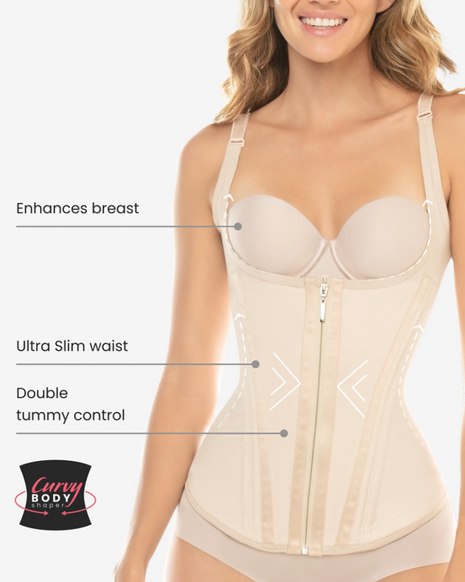 Introducing Style 1328: Revolutionize your silhouette with our Vest with V Shape & Zipper. Crafted to perfection, this garment combines innovative design with premium materials for unparalleled waist definition and comfort. The V-shaped rods integrated into the vest ensure a dramatic and ultra-slim waistline, while the triple hook closure offers adjustable levels of compression for a customized fit. Featuring a double-layer zipper closure, this vest provides secure yet flexible support, allowing you to move with confidence throughout your day. Say goodbye to bulk and hello to sleek sophistication with Style 1328.