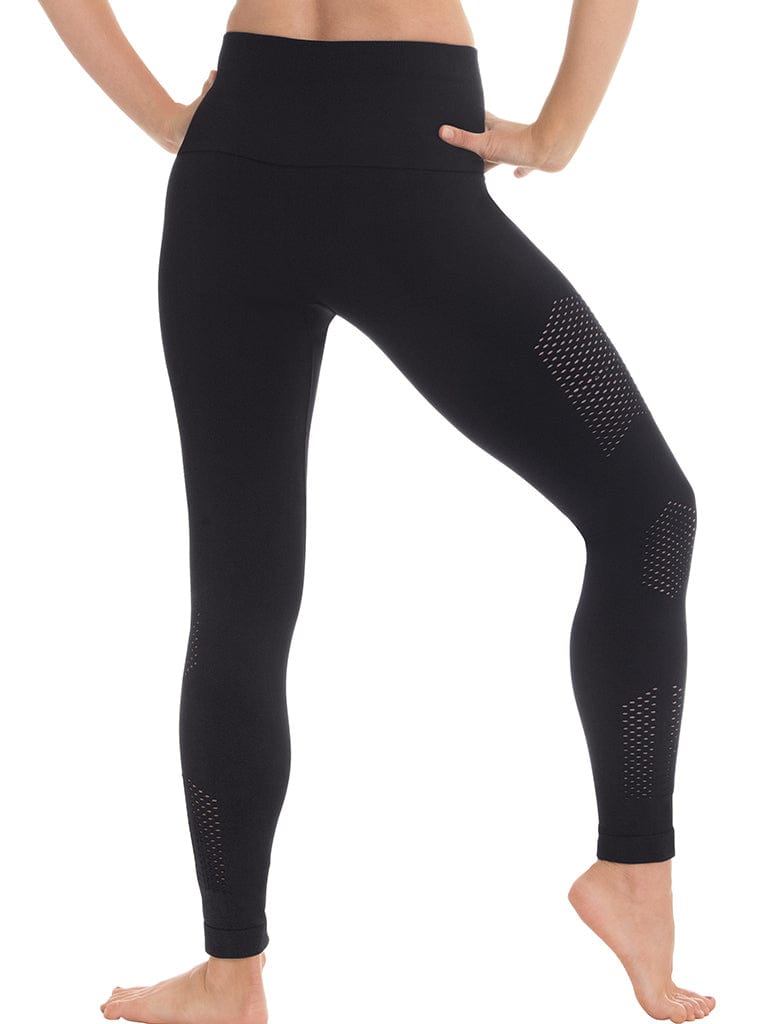 Microfiber seamless leggings with wide tummy control band and integrated open mesh detail on the legs. These leggings will slim and support while being fashionable and comfortable. Integrated gusset for comfort and ease of movement. Firm support.
