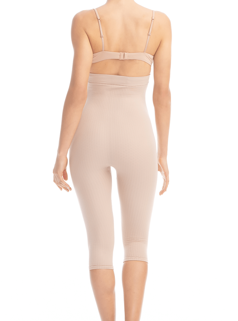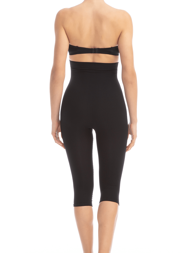 High waist above knee slimming pants in microfiber, with massaging effect due to the texture of the product with coarse and smooth areas which help fighting the imperfections caused by cellulite, thanks to the continuous body movement. It is manufactured with a revolutionary breathable cross-hatch knitting design with an hygienic and antibacterial gusset.