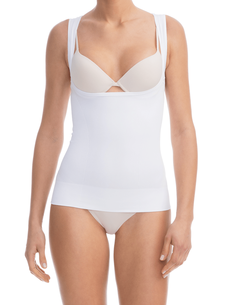 Open bust camisole with tummy and hips shaping band, without seams. Thanks to its particular construction, without cups but with supporting band, the vest pulls and lifts up the everyday bra, increasing the push up effect. High double layer elastic band preventing it from rolling up at waist and invisible underneath any piece of clothing. The vest guarantees the maximum comfort thanks to its seamless construction.