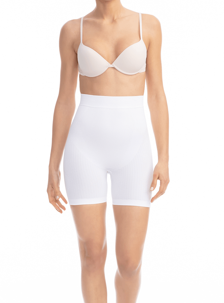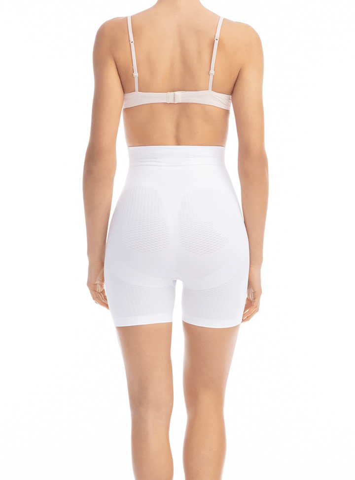 Mid thigh shorts in microfiber with slimming, modeling, shaping and massaging effect. The texture of the product, with coarse and smooth areas, massages and helps fighting the imperfections caused by cellulite, thanks to the continuous body movement. The graduated-pressure elastic bands guarantee a modeling and redefining push-up effect to the body. The product is manufactured with a revolutionary breathable cross-hatch knitting design and an hygienic and antibacterial gusset.