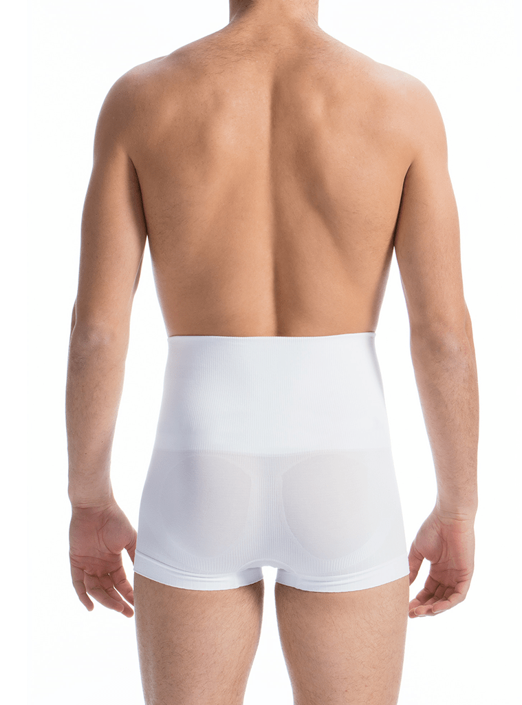 High waist Boxer for men in elasticized cotton with powerful girdle to reduce and shape the waistline and band for a derriere push up and shaping effect. Seamless construction and anatomical shapes for the maximum comfort, high double layer elastic band for a strong and effective pressure. Hygienic and antibacterial gusset with silver fiber. Invisible underneath any piece of clothing.