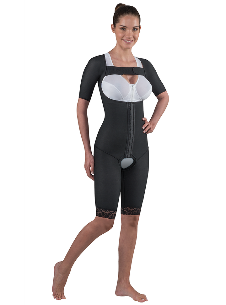 The Elegance Combi Suit is the combination of an Arm Sleeve garment with a short Combi. It is equipped with two Velcro straps, above and below the breast for maximum adjustability and two rows of hook and eye closure and is open at the crotch. It is also adorned with lace trimming.