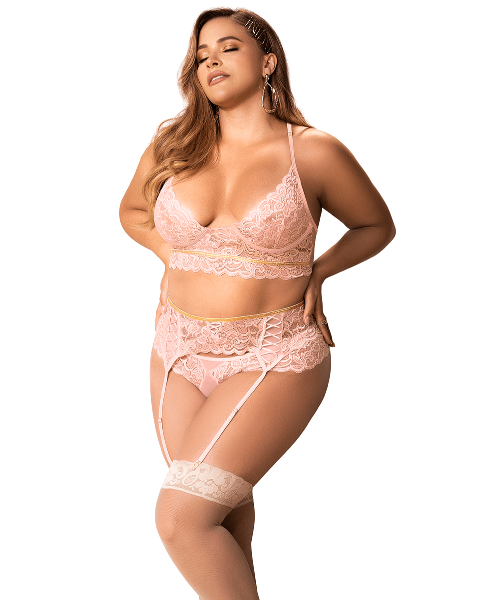 Luxury and sophistication in this three-piece delicate rosewood lace set with gold accents. Top with adjustable straps, garter with interlaced ribbon detail and matching panty.