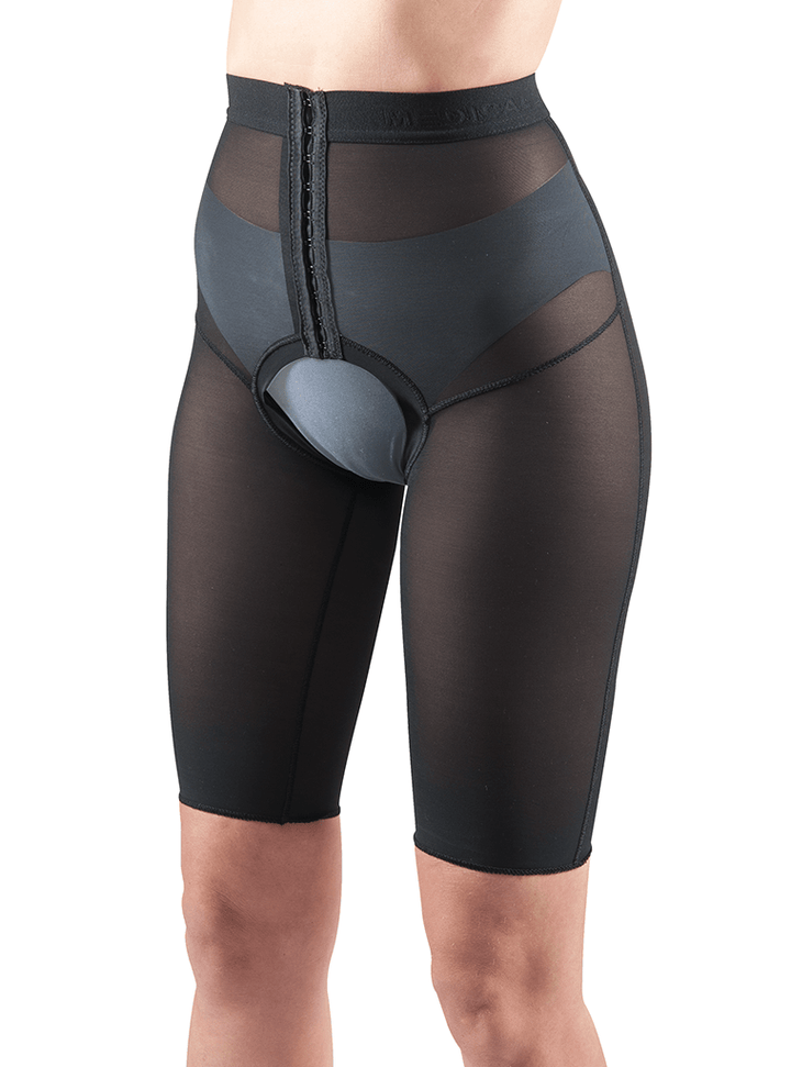 The Standard Short Lipo-Panty® Waist Height is equipped with two rows of hook and eye closure and is open at the crotch.